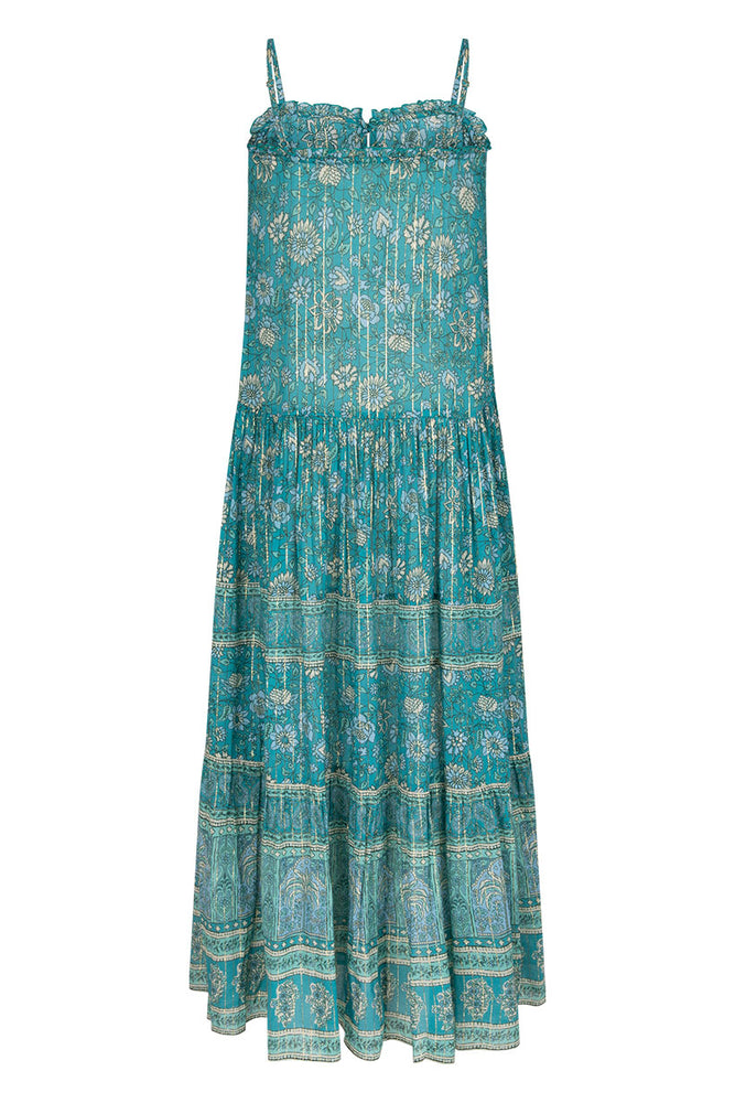 Unleash your inner muse with the Elysian Strappy Maxi Dress in Jade. This eco-friendly dress features an allover print with a bold border print on the hem, perfect for making a statement. The gathered skirt and adjustable straps add a touch of playfulness. Made with soft and sustainable organic cotton and viscose blend, with a hint of metallic for an extra touch of glamour. Take on the world in this stunning and fearless dress.